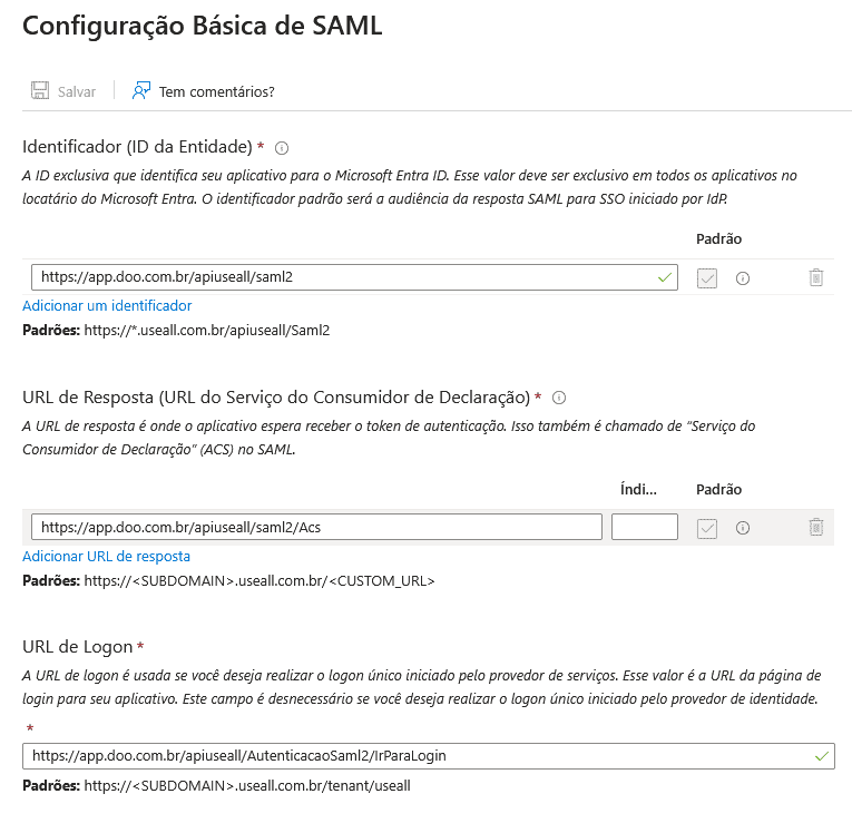 No quadro "Configuração Básica de SAML" colocar os links abaixo:
