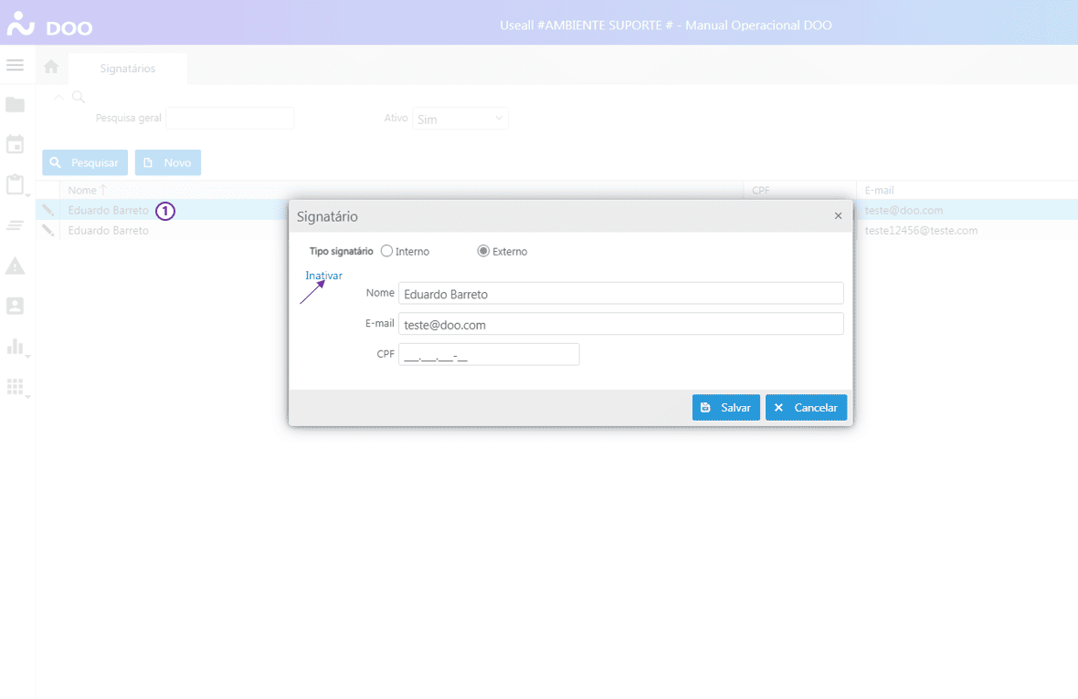 O signatário interno, tem como base os dados utilizados no cadastro de usuário no DOO, trazendo o nome e o e-mail automaticamente. O campo CPF é opcional.Já para o signatário externo, é necessário preencher todos os dados. O campo CPF é opcional