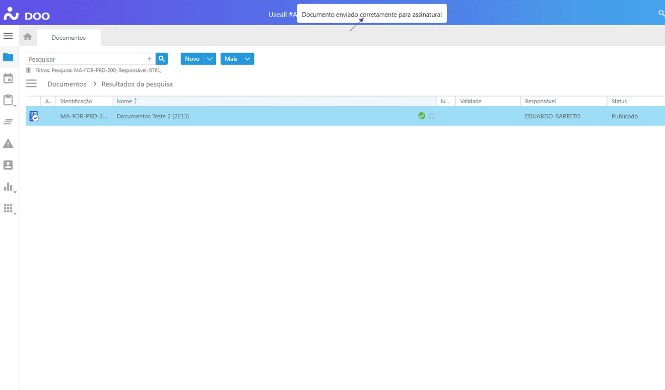 Quando todos os signatários realizarem a assinatura, o documento assinado estará disponível no sistema DOO. Para visualizar o documento assinado no sistema DOO, localizar o documento, clicar no botão "Mais" > "Visualizar documento assinado".Aviso