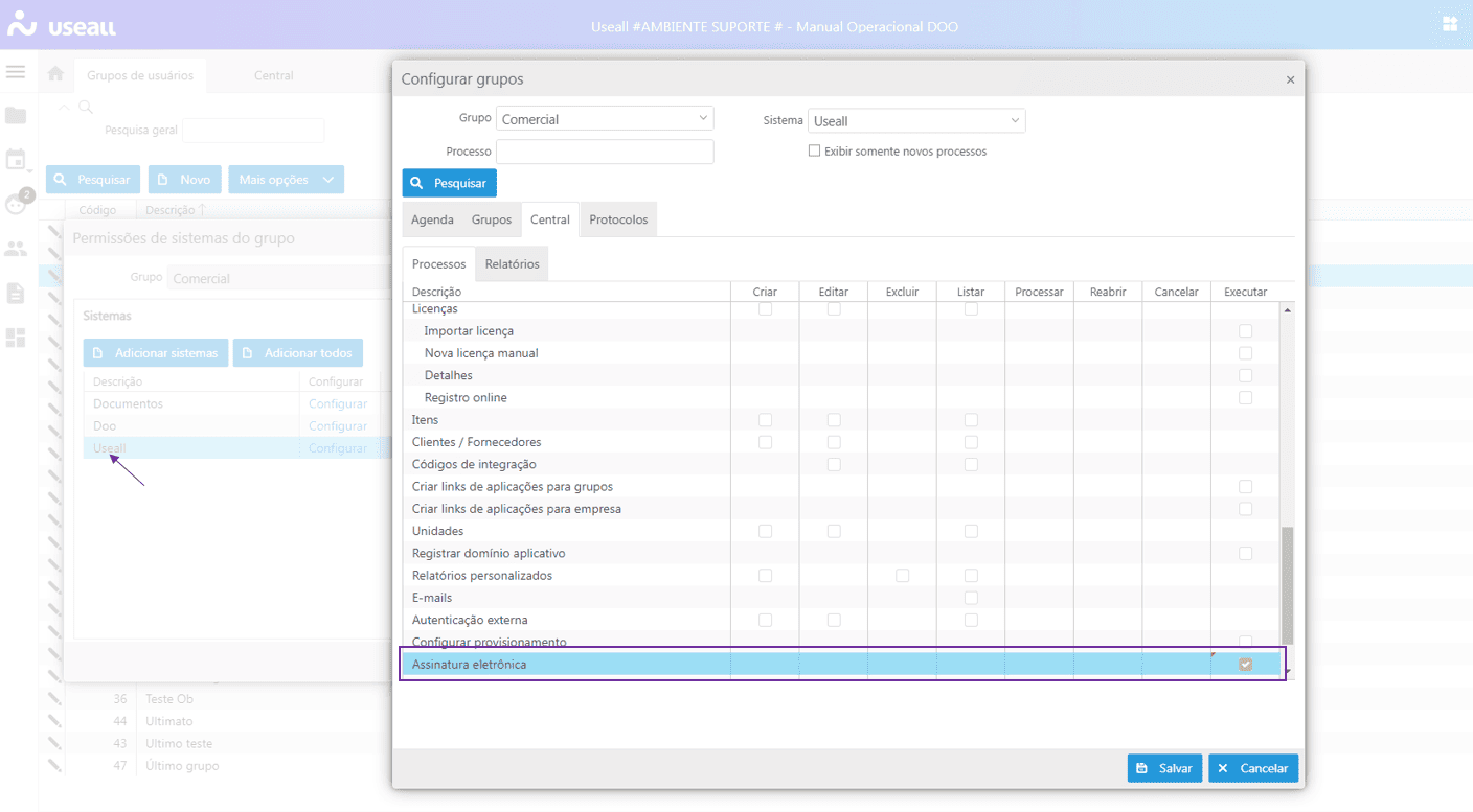 Para utilizar o recurso de assinatura eletrônica, é necessário habilitar a permissão "Assinatura Eletrônica" no sistema "Documentos" na Central Useall