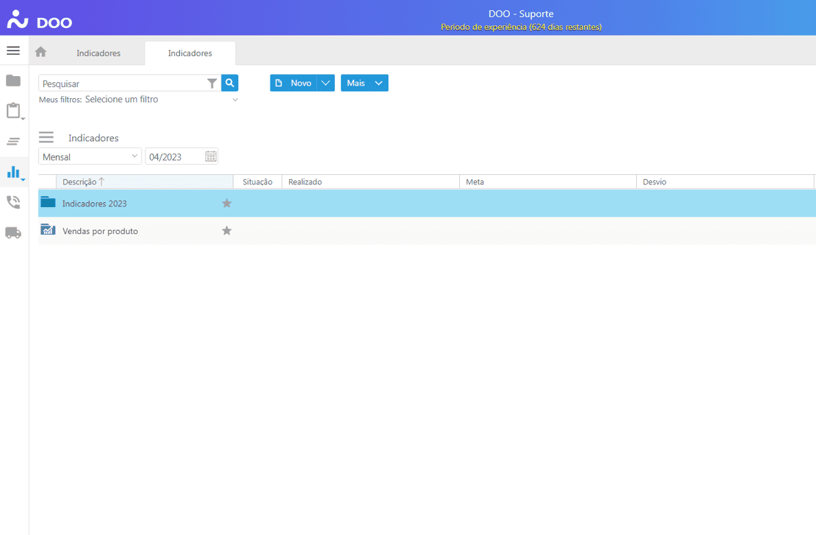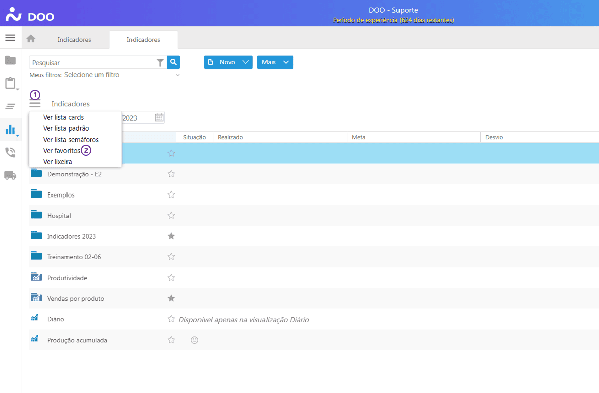 Caso o indicador tenha o controle de meta, o DOO destaca em verde aquele que está dentro da meta e em vermelho o indicador fora da meta.A opção ver lista padrão, é o formato padrão de apresentação do sistema.